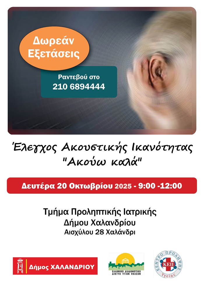 Τη δυνατότητα δωρεάν ελέγχου ακουστικής ικανότητας δίνει σε όλους το ΚΕΠ Υγείας του Δήμου Χαλανδρίου σε συνεργασία με το Ελληνικό Διαδημοτικό Δίκτυο Υγιών Πόλεων του Παγκόσμιου Οργανισμού Υγείας (ΠΟΥ).