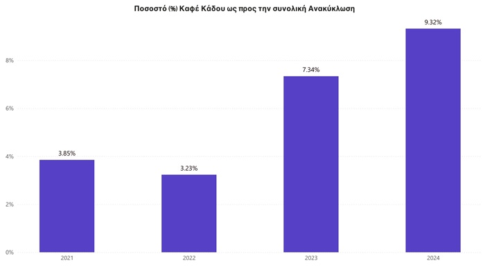 Εξίσου αποκαλυπτικό είναι και το στοιχείο που δείχνει ότι η ανακύκλωση του καφέ κάδου έφτασε στο 9,32% του συνολικού όγκου της ανακύκλωσης, τη χρονιά που πέρασε, από 3,85% το 2021.