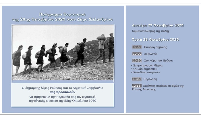 Ο δήμαρχος Χαλανδρίου Σίμος Ρούσσος και το Δημοτικό Συμβούλιο σας προσκαλούν να τιμήσετε με την παρουσία σας τις εορταστικές εκδηλώσεις του Δήμου για την εθνική επέτειο της 28ης Οκτωβρίου 1940.