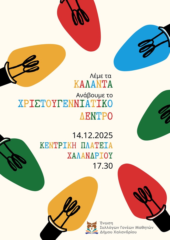 Ένωση Γονέων Χαλανδρίου: «Λέμε τα κάλαντα – Ανάβουμε το χριστουγεννιάτικο δέντρο» 11-12-25 ΕΙΔΗΣΕΙΣ Η Ένωση Συλλόγων Γονέων Μαθητών Χαλανδρίου σας προσκαλεί σε μια χριστουγεννιάτικη δράση στην καρδιά της πόλης: Έρχεται η πιο γιορτινή στιγμή του Δεκέμβρη! Κυριακή 14 Δεκεμβρίου 2025 17:30 Κεντρική Πλατεία Χαλανδρίου Θα τραγουδήσουμε τα κάλαντα παρέα με τα παιδιά των Δημοτικών Σχολείων. Θα στήσουμε και θα φωτίσουμε το πιο πολύχρωμο χριστουγεννιάτικο δέντρο της πόλης. Φορέστε το πιο ζεστό σας χαμόγελο, ελάτε με γιορτινή διάθεση και ετοιμαστείτε για μια βραδιά γεμάτη φως, μουσική, παιχνίδι και μαγεία!