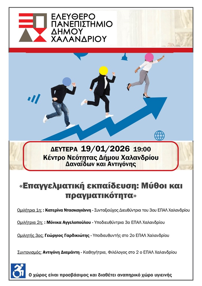 Το Ελεύθερο Πανεπιστήμιο του Δήμου Χαλανδρίου φιλοξενεί την πολύ ενδιαφέρουσα εκδήλωση με θέμα: «Επαγγελματική Εκπαίδευση: Μύθοι και Πραγματικότητα», τη Δευτέρα 19 Ιανουαρίου 2026 και ώρα 19:00, στο Κέντρο Νεότητας (Δαναΐδων & Αντιγόνης, Χαλάνδρι).