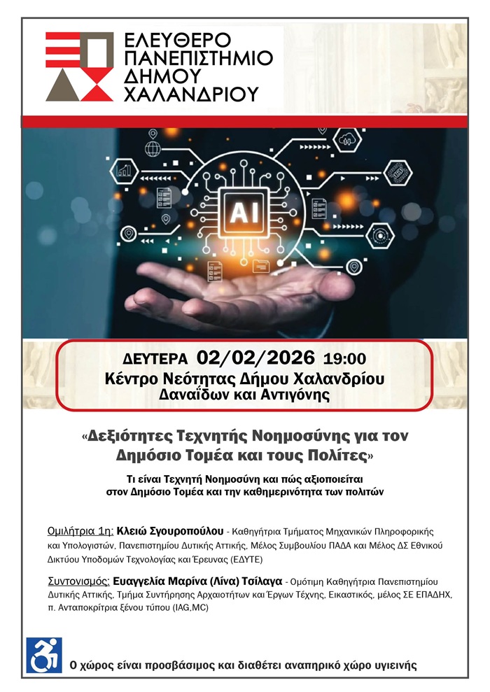 Tο Ελεύθερο Πανεπιστήμιο του Δήμου Χαλανδρίου φιλοξενεί μια πολύ ενδιαφέρουσα εκδήλωση (η οποία ανοίγει την εαρινή περίοδο) με θέμα: «Δεξιότητες Τεχνητής Νοημοσύνης για τον Δημόσιο Τομέα και τους Πολίτες», τη Δευτέρα 2 Φεβρουαρίου 2026 και ώρα 19:00, στο Κέντρο Νεότητας (Δαναΐδων & Αντιγόνης, Χαλάνδρι).