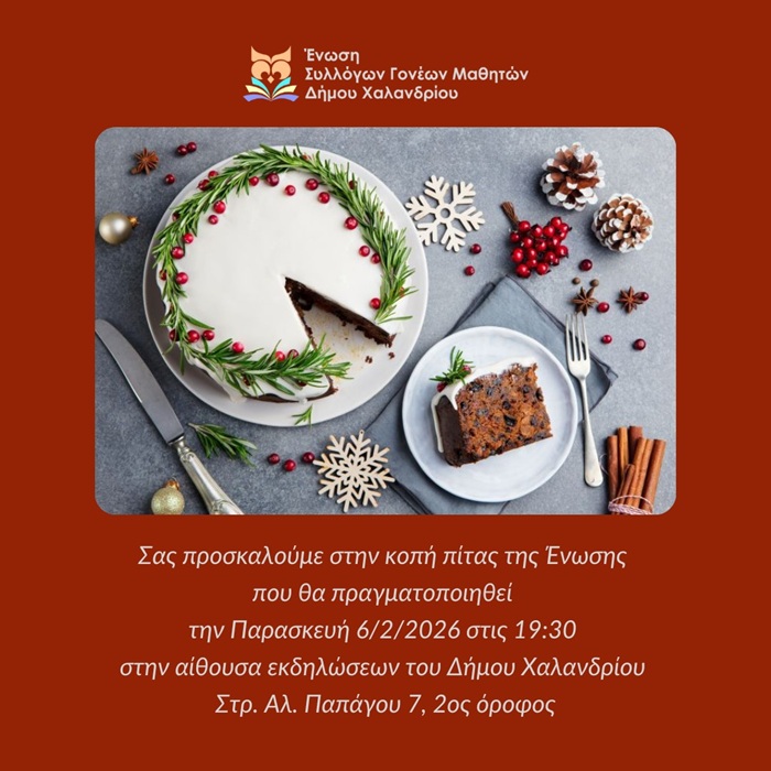 H Ένωση Συλλόγων Γονέων Μαθητών Χαλανδρίου προσκαλεί στην κοπή της πίτας της, που θα πραγματοποιηθεί την Παρασκευή 6 Φεβρουαρίου 2026 στις 19:30, στην αίθουσα εκδηλώσεων του Δήμου Χαλανδρίου (Στρ. Αλ. Παπάγου 7, 2ος όροφος).