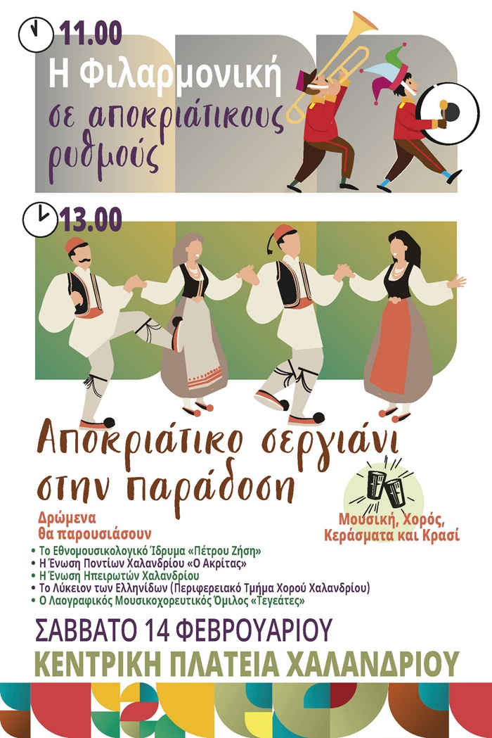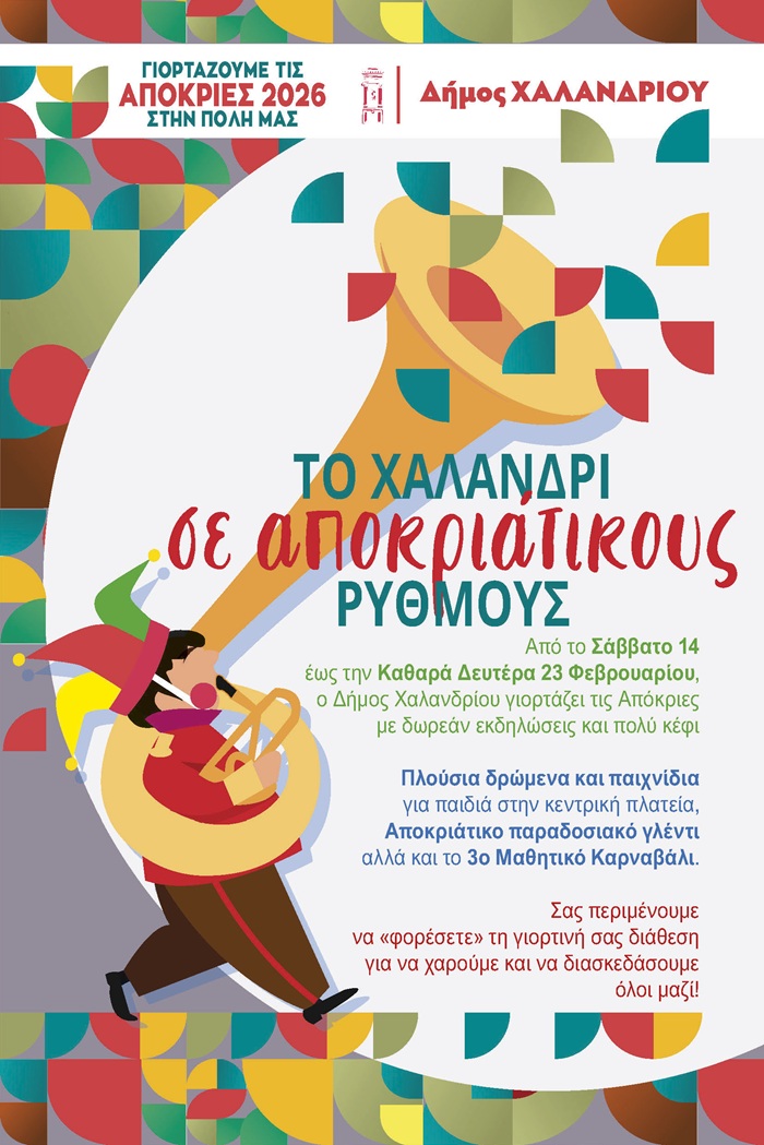 Ο Δήμος Χαλανδρίου καλεί όλες και όλους να συμμετάσχουν ενεργά στις φετινές αποκριάτικες εκδηλώσεις, ενισχύοντας το πνεύμα της συλλογικότητας, της δημιουργίας και της χαράς.