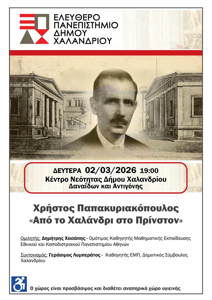 Το Ελεύθερο Πανεπιστήμιο του Δήμου Χαλανδρίου τιμά έναν σπουδαίο Χαλανδραίο που έγραψε τη δική του ιστορία μέσα από μια σπουδαία διάλεξη με θέμα: «Χρήστος Παπακυριακόπουλος – Από το Χαλάνδρι στο Πρίνστον», τη Δευτέρα 2 Μαρτίου 2026 και ώρα 19:00, στο Κέντρο Νεότητας (Δαναΐδων & Αντιγόνης, Χαλάνδρι).