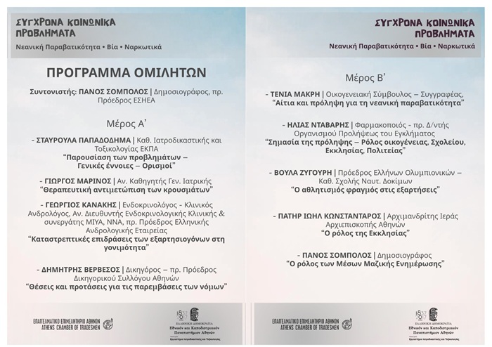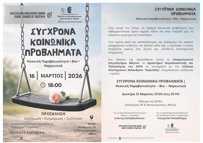 Ο Σύλλογος Επιστημόνων Χαλανδρίου «Ευριπίδης», σε συνεργασία με το Επαγγελματικό Επιμελητήριο Αθηνών και το Εργαστήριο Ιατροδικαστικής και Τοξικολογίας του Εθνικού και Καποδιστριακού Πανεπιστημίου Αθηνών, διοργανώνει εκδήλωση - ομιλία με θέμα «Σύγχρονα Κοινωνικά Προβλήματα – Νεανική Παραβατικότητα, Βία, Ναρκωτικά», τη Δευτέρα 16 Μαρτίου 2026, στις 18:00, στην αίθουσα της Ε.Σ.Η.Ε.Α. (Ακαδημίας 20 & Βουκουρεστίου, Αθήνα). Η είσοδος είναι ελεύθερη.