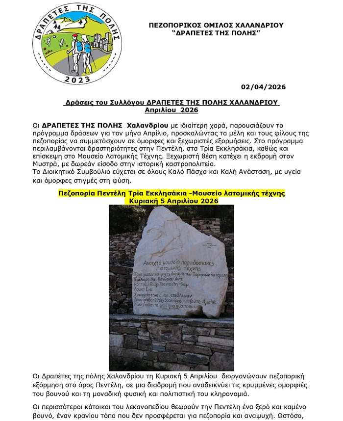 Οι “Δραπέτες της πόλης Χαλανδρίου” ανακοινώνουν τις δράσεις τους για τον μήνα Απρίλιο 2026: