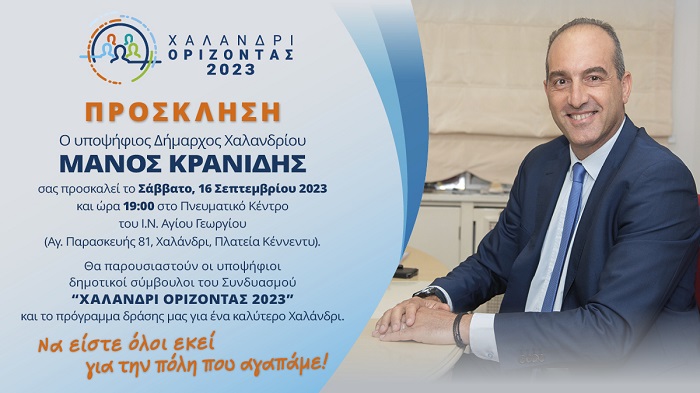 Ο υποψήφιος Δήμαρχος ΧαλανδρίουΜΑΝΟΣ ΚΡΑΝΙΔΗΣσας προσκαλεί το Σάββατο, 16 Σεπτεμβρίου 2023 και ώρα 19:00στο Πνευματικό Κέντρο του Ι.Ν. Αγίου Γεωργίου(Αγ. Παρασκευής 81, Χαλάνδρι, Πλατεία Κέννεντυ).