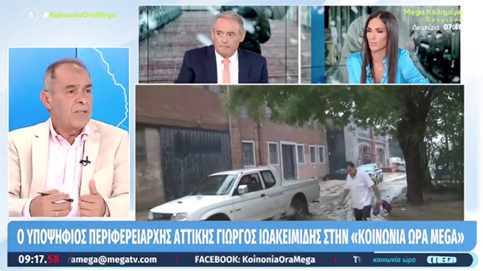 Σε συνέντευξή του στο Mega (Ι. Χασαπόπουλος και Α. Βούλγαρη) ο υποψήφιος Περιφερειάρχης Αττικής, Γιώργος Ιωακειμίδης, έκανε εκτενή αναφορά στις πλημμύρες στη πρωτεύουσα, καθώς και στην ανάγκη αναβάθμισης της Πολιτικής