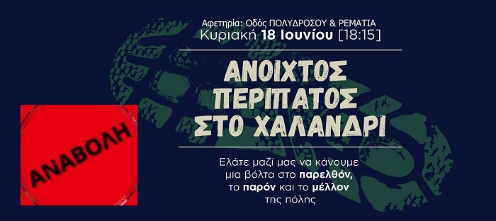 Ο Δήμος Χαλανδρίου ενημερώνει ότι, αναβάλλεται λόγω του καιρού, ο προγραμματισμένος, για το απόγευμα της Κυριακής 18 Ιουνίου, ιστορικός - καλλιτεχνικός περίπατος στα ίχνη του Αδριάνειου Υδραγωγείου, εκδήλωση η οποία περιλαμβανόταν