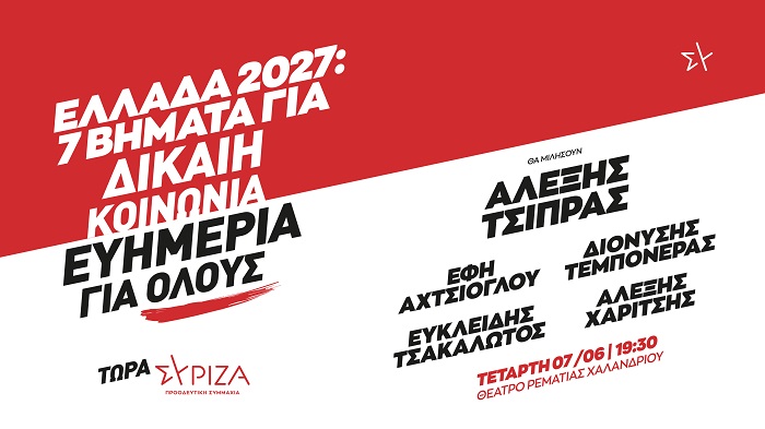 Ο πρόεδρος του ΣΥΡΙΖΑ - Προοδευτική Συμμαχία, Αλέξης Τσίπρας θα απευθύνει ομιλία την Τετάρτη 7 Ιουνίου 2023 στην προγραμματική εκδήλωση του ΣΥΡΙΖΑ-ΠΣ «Ελλάδα 2027: Επτά βήματα για Δίκαιη Κοινωνία και Ευημερία
