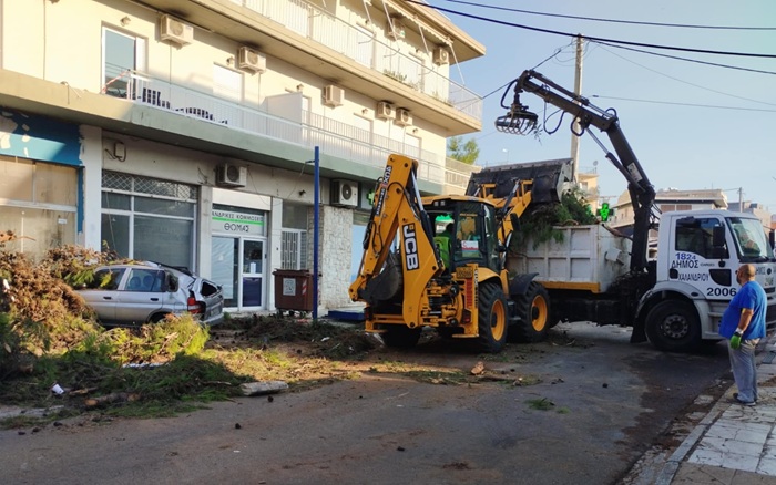 Μετά από μια δύσκολη, ολονύχτια επιχείρηση ολοκληρώθηκε το πρωί του Σαββάτου 9 Αυγούστου, η αποκατάσταση του προβλήματος που προκλήθηκε από πτώση δέντρου λόγω των ισχυρών ανέμων, στην πλατεία Φλύας στο