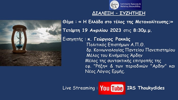 Το Ινστιτούτο Έρευνας και Μελέτης “Θουκυδίδης” διοργανώνει διαδικτυακή διάλεξη - συζήτηση με θέμα «Η Ελλάδα στο τέλος της Μεταπολίτευσης;», την Τετάρτη