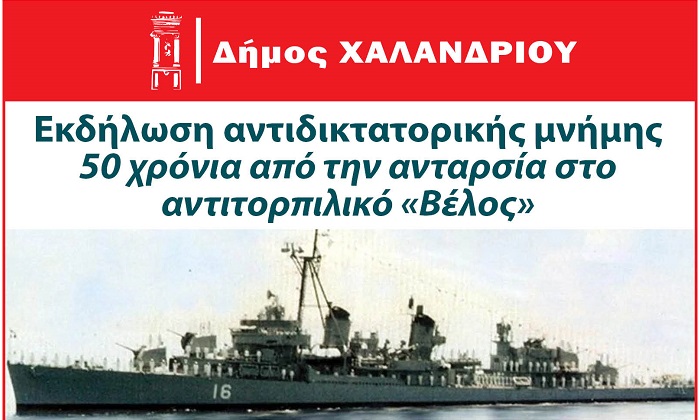 Ο Δήμος Χαλανδρίου διοργανώνει εκδήλωση αντιδικτατορικής μνήμης και τιμής για τα 50 χρόνια από την ανταρσία στο αντιτορπιλικό «Βέλος», στις 25 Μαΐου 1973, γεγονός το οποίο κατάφερε ισχυρό πλήγμα στη