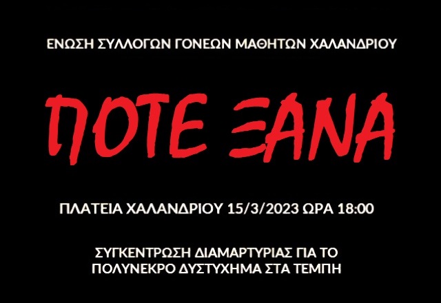 Κάλεσμα σε συγκέντρωση διαμαρτυρίας για το πολύνεκρο δυστύχημα στα Τέμπη απευθύνει η Ένωση Συλλόγων Γονέων Μαθητών Χαλανδρίου. Αναλυτικά η ανακοίνωση: H Ένωση Συλλόγων Γονέων Μαθητών Χαλανδρίου εκφράζει τα θερμά της