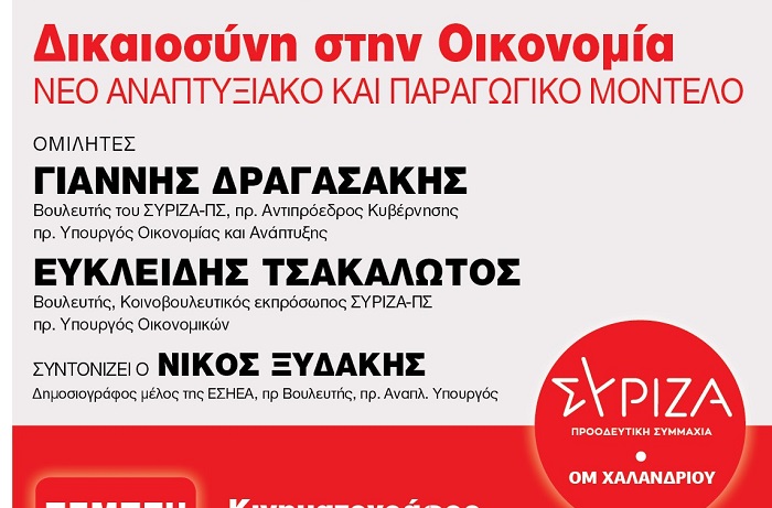 Η Ο.Μ. ΣΥΡΙΖΑ-Π.Σ. Χαλανδρίου διοργανώνει εκδήλωση συζήτηση με θέμα «Δικαιοσύνη στην Οικονομία / Νέο Αναπτυξιακό Παραγωγικό Mοντέλο», την Πέμπτη 2