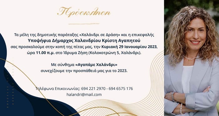 ΠΡΟΣΚΛΗΣΗ Σας προσκαλούμε στην πίτα του συνδυασμού μας «Χαλάνδρι σε Δράση» την Κυριακή 29 Ιανουαρίου 2023 και ώρα 11:00 π.μ. στο Ίδρυμα Ζήση (Κολοκοτρώνη 5, Χαλάνδρι). Η επικεφαλής-υποψήφια Δήμαρχος Χαλανδρίου