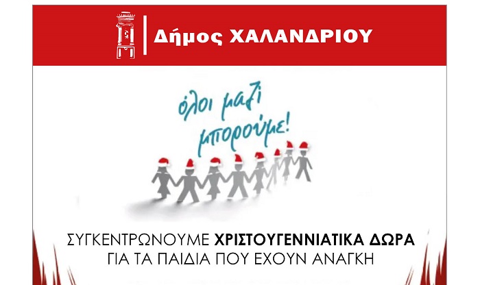 Ο Δήμος Χαλανδρίου συμμετέχει και φέτος στην κοινωφελή δράση «ΟΛΟΙ ΜΑΖΙ ΜΠΟΡΟΥΜΕ», συγκεντρώνοντας χριστουγεννιάτικα δώρα για παιδιά.