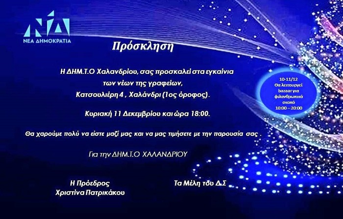 Η ΔΗΜ.Τ.Ο. Νέας Δημοκρατίας Χαλανδρίου σας προσκαλεί στα εγκαίνια των νέων της γραφείων (Κατσουλιέρη 4, Χαλάνδρι - 1ος όροφος), την Κυριακή 11 Δεκεμβρίου 2022 και ώρα 18:00.