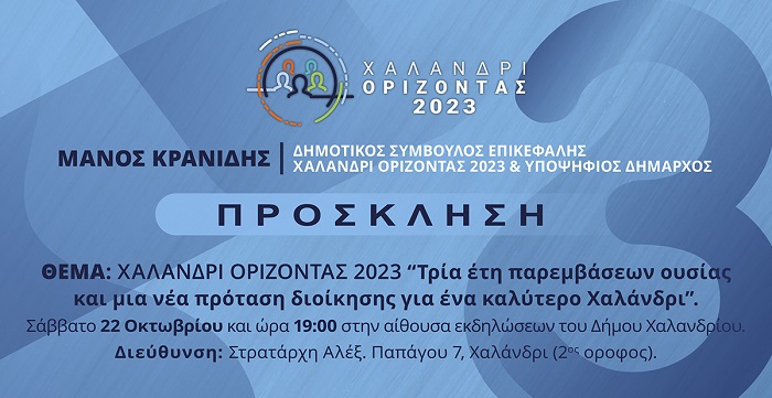 ΠΡΟΣΚΛΗΣΗ Ο Δημοτικός Συνδυασμός “Χαλάνδρι σε Δράση” και η επικεφαλής του Κρίστη Αγαπητού, υποψήφια δήμαρχος Χαλανδρίου, σας προσκαλούν σε εκδήλωση - wine evening με θέμα «Οι γυναίκες στο προσκήνιο - Πολιτική, Κοινωνία,