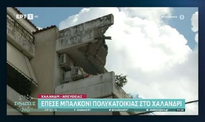 Κατέρρευσε μπαλκόνι πολυώροφης πολυκατοικίας στο Χαλάνδρι, στην οδό Κουρτέση 27, λόγω διάβρωσης, χωρίς ευτυχώς να υπάρξουν τραυματισμοί.