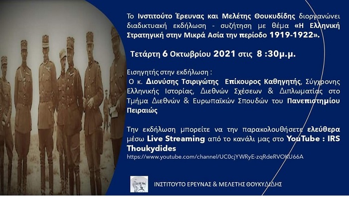 Το Ινστιτούτο Έρευνας και Μελέτης “Θουκυδίδης” με αφορμή την παρουσίαση του βιβλίου «Η Ελληνική Στρατηγική στη Μικρά Ασία 1919-1922» διοργανώνει