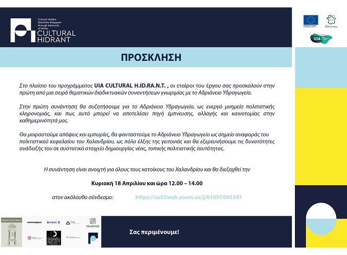 Η πρώτη διαδικτυακή συνάντηση «Δημιουργικές HIDRANT ζυμώσεις» στο πλαίσιο υλοποίησης του ευρωπαϊκού προγράμματος CULTURAL HIDRANT πραγματοποιείται την Κυριακή 18 Απριλίου και ώρα 12:00-14:00 (μέσω zoom) και είναι ανοιχτή για όλους