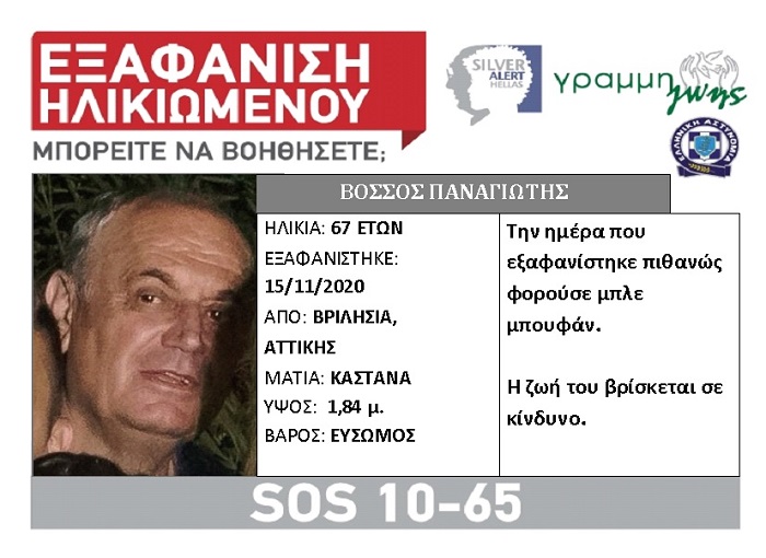 Ο Παναγιώτης Βόσσος, 67 ετών, εξαφανίστηκε στις 15/11/2020 από τα Βριλήσσια, έχει