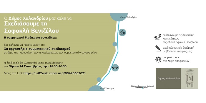 Προς την ολοκλήρωσή της βαίνει η διαδικασία του συμμετοχικού σχεδιασμού της βιώσιμης κινητικότητας της Σοφοκλή Βενιζέλου, στο Κάτω Χαλάνδρι. Την