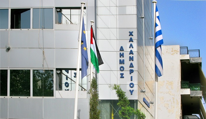 Σε μια ελάχιστη ένδειξη αλληλεγγύης προς τον παλαιστινιακό λαό, ο Δήμος Χαλανδρίου ύψωσε την παλαιστινιακή σημαία στο δημαρχείο της πόλης,