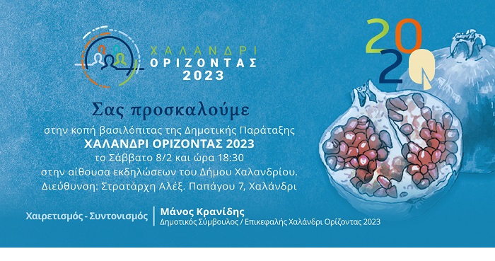 Η δημοτική παράταξη “Χαλάνδρι Ορίζοντας 2023” προσκαλεί στην κοπή της βασιλόπιτας, το Σάββατο 8 Φεβρουαρίου 2020 και ώρα 18:30, στην