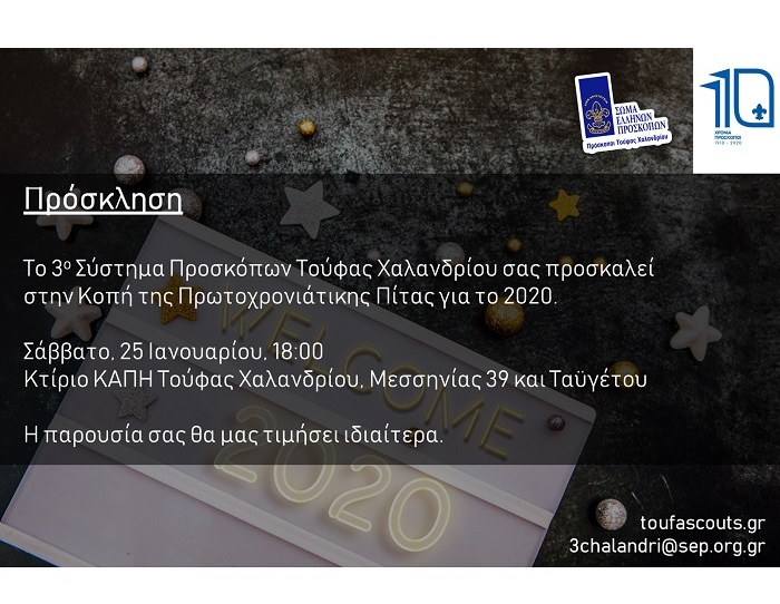Το 3ο Σύστημα Προσκόπων Τούφας Χαλανδρίου προσκαλεί στην κοπή της πρωτοχρονιάτικης πίτας του για το 2020.