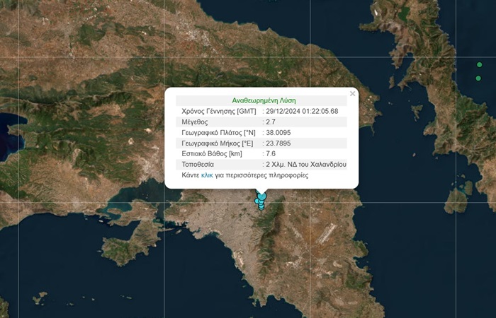 Σεισμική δόνηση μεγέθους 2,7 βαθμών της κλίμακας Ρίχτερ σημειώθηκε στις 03:22 τα ξημερώματα της Κυριακής (29/12), με το επίκεντρο να