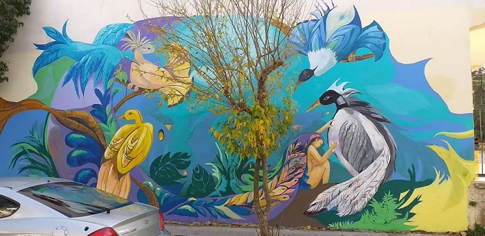 Εικόνες από την εντυπωσιακή τοιχογραφία (mural) που δημιούργησε η καλλιτέχνις Juana Page σε εξωτερικό τοίχο του 1ου Λυκείου Χαλανδρίου, με
