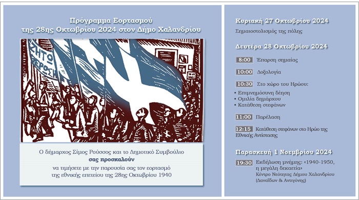 O δήμαρχος Χαλανδρίου Σίμος Ρούσσος και το Δημοτικό Συμβούλιο σας προσκαλούν να τιμήσετε με την παρουσία σας τον εορτασμό της εθνικής επετείου της 28ης Οκτωβρίου 1940.