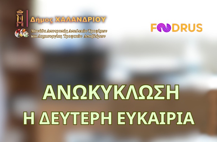 Ο Δήμος Χαλανδρίου προσκαλεί στην παρουσίαση των αποτελεσμάτων της πειραματικής εφαρμογής του Food Upcycling, ή αλλιώς της ΑνΩκύκλωσης τροφών, την Τρίτη 30 Απριλίου 2024, στις 11:30 π.μ., Σολωμού 10 - Χαλάνδρι,