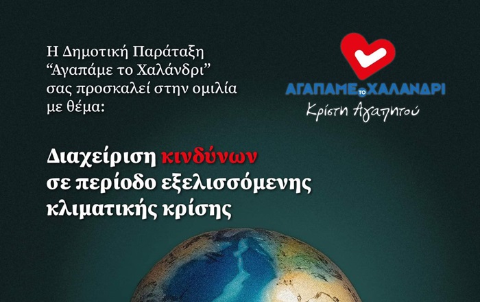 Η δημοτική παράταξη “Αγαπάμε το Χαλάνδρι” προσκαλεί στην ομιλία με θέμα: «Διαχείριση κινδύνων σε περίοδο εξελισσόμενης κλιματικής κρίσης».