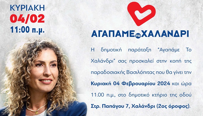 Η δημοτική παράταξη “Αγαπάμε το Χαλάνδρι” σας προσκαλεί στην κοπή της παραδοσιακής Βασιλόπιτας που θα γίνει την Κυριακή 4