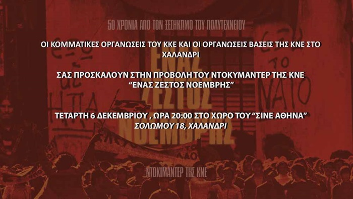 Οι κομματικές οργανώσεις του ΚΚΕ και οι οργανώσεις βάσεις της ΚΝΕ στο Χαλάνδρι προσκαλούν στην προβολή του ντοκιμαντέρ της ΚΝΕ