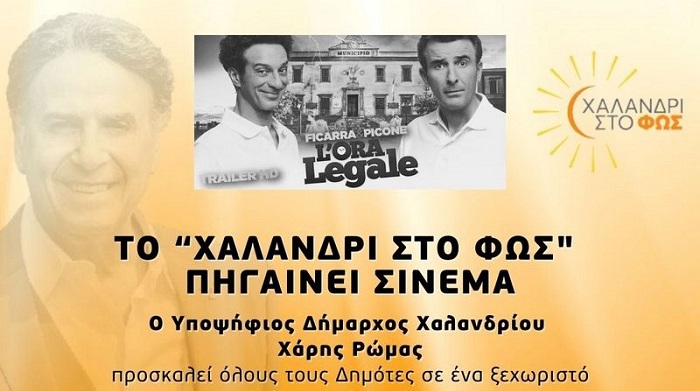 Ο υποψήφιος δήμαρχος Χαλανδρίου Χάρης Ρώμας προσκαλεί τους δημότες σε ένα ξεχωριστό κινηματογραφικό πρωινό την Κυριακή 1η Οκτωβρίου 2023 στις 11:00 π.μ. στον κινηματογράφο ΑΙΓΛΗ. Θα προβληθεί η ιταλική κωμωδία