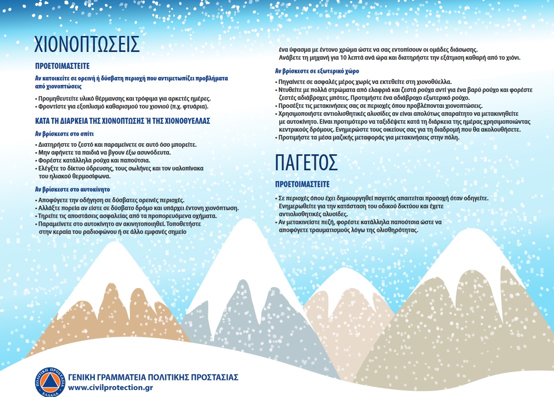 - Να περπατούν με μεγάλη προσοχή ιδιαίτερα τις πρώτες πρωινές και νυκτερινές ώρες, καθώς υπάρχει μεγάλη πιθανότητα οι δρόμοι να είναι παγωμένοι.