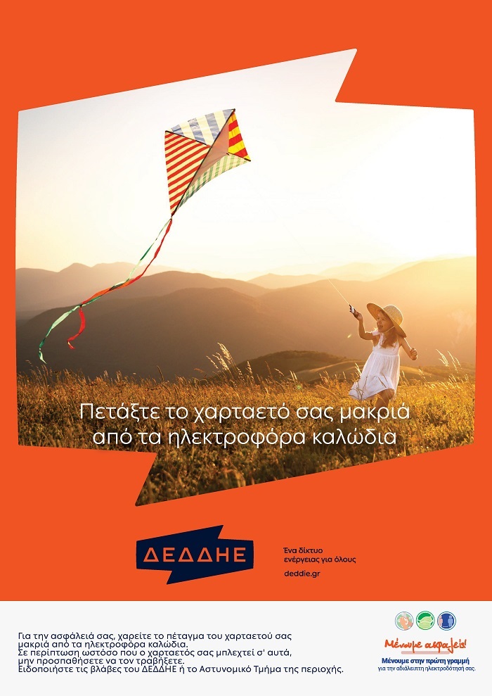 Ο Διαχειριστής Ελληνικού Δικτύου Διανομής Ηλεκτρικής Ενέργειας (ΔΕΔΔΗΕ), σας συμβουλεύει να μην πετάτε τον χαρταετό σας κοντά σε ηλεκτροφόρα καλώδια, καθώς υπάρχει σοβαρός κίνδυνος ηλεκτροπληξίας για εσάς και διακοπής της παροχής ρεύματος στη γύρω περιοχή.