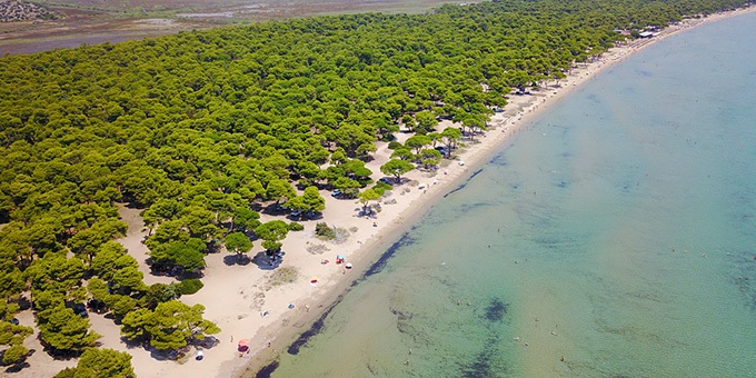 Ξεκινάμε από τα Πεύκα του Σχινιά, η μεγάλη, αφράτη και απολύτως ελεύθερη αμμουδιά των οποίων απλώνεται στις παρυφές του μεγάλου πευκοδάσους (ό,τι πρέπει και για φυσιολατρικές πεζοπορίες, αν βαριέσαι να κάθεσαι όλη μέρα παραλία). Τα νερά του είναι κρυστάλλινα (εκτός αν φυσάει Νοτιοανατολικός άνεμος, στην οποία περίπτωση βγαίνει φυκάδα) ενώ αν θες και την ξαπλώστρα σου, στην παρακείμενη οργανωμένη πλαζ του Μωραΐτη θα τη βρεις -χωρίς είσοδο, με μια ελάχιστη κατανάλωση της τάξης των 5€ από το beach bar.