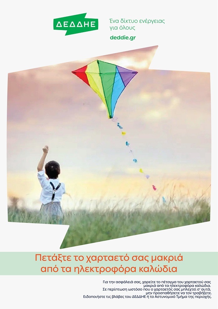 Ο Διαχειριστής Ελληνικού Δικτύου Διανομής Ηλεκτρικής Ενέργειας (ΔΕΔΔΗΕ), σας συμβουλεύει να μην πετάτε τον χαρταετό σας κοντά σε ηλεκτροφόρα καλώδια, καθώς υπάρχει σοβαρός κίνδυνος ηλεκτροπληξίας για εσάς και διακοπής της παροχής ρεύματος στη γύρω περιοχή.