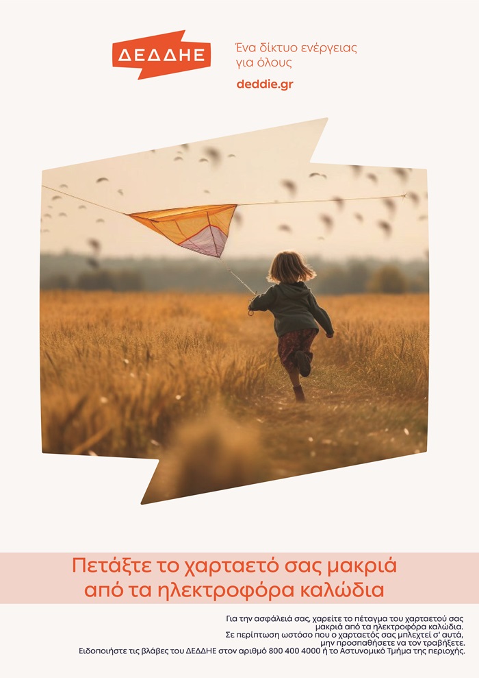 Ο Διαχειριστής Ελληνικού Δικτύου Διανομής Ηλεκτρικής Ενέργειας (ΔΕΔΔΗΕ), σας συμβουλεύει να μην πετάτε τον χαρταετό σας κοντά σε ηλεκτροφόρα καλώδια, καθώς υπάρχει σοβαρός κίνδυνος ηλεκτροπληξίας για εσάς και διακοπής της παροχής ρεύματος στη γύρω περιοχή.