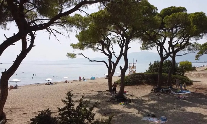 Το σκηνικό θυμίζει εθνικό πάρκο, και όχι άδικα: οι κουκουναριές φτάνουν σχεδόν μέχρι την άκρη του νερού, προσφέροντας φυσική σκιά και δημιουργώντας έναν δροσερό παράδεισο ιδανικό για πικ-νικ ή απογευματινή χαλάρωση. Η αμμουδιά είναι λεπτή και απαλή, ενώ τα ρηχά, ήρεμα νερά κάνουν την παραλία κατάλληλη ακόμα και για πολύ μικρά παιδιά.