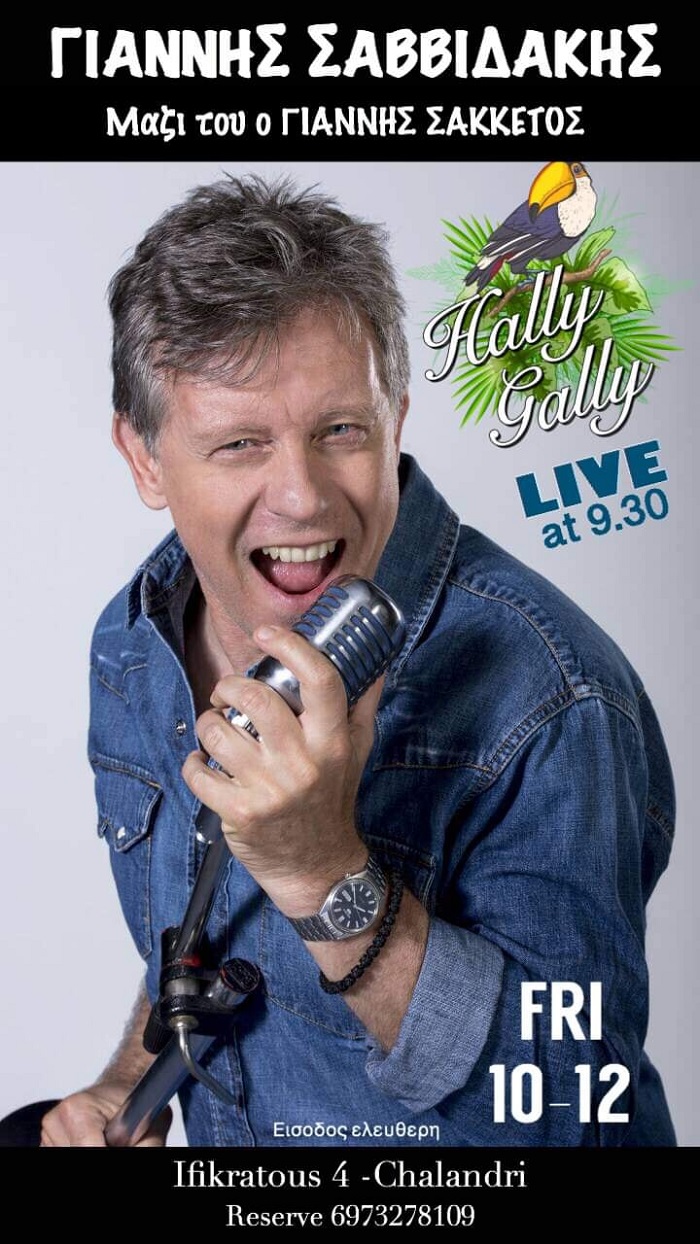 Δεν γινόταν να μην επαναλάβουμε live με τον Γιάννη Σαββιδάκη! Η μεγάλη αποδοχή του κόσμου, που άφησε αρκετούς φίλους εκτός, την τελευταία φορά, αλλά και η έντονη επιθυμία μας να ξαναζήσουμε την όμορφη αυτή μουσική εμπειρία μαζί του, μας οδήγησε σε ακόμα δύο εμφανίσεις του μέσα στον Δεκέμβριο! Την Παρασκευή λοιπόν 10 Δεκεμβρίου, χωρίς συστάσεις, αλλά με πολλή αγάπη, ενέργεια, όρεξη και με τη συμμετοχή του Γιάννη Σακκέτου, όσοι πιστοί, ραντεβού στο Hally Gally.