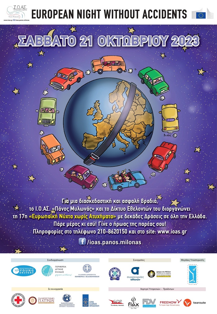 To Ινστιτούτο Οδικής Ασφάλειας (Ι.Ο.ΑΣ.) «Πάνος Μυλωνάς» συνεχίζει δυναμικά τις δράσεις ενεργοποίησης και ευαισθητοποίησης των πολιτών για «έναν κόσμο χωρίς τροχαία δυστυχήματα». Έτσι, το Σάββατο 21 Οκτωβρίου 2023, διοργανώνει, όπως κάθε χρόνο, τη 17η «Ευρωπαϊκή Νύχτα χωρίς Ατυχήματα» σε μεγάλες πόλεις στην Ελλάδα.