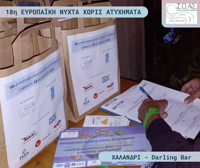 Το Ινστιτούτο Οδικής Ασφάλειας (Ι.Ο.ΑΣ.) «Πάνος Μυλωνάς» διοργανώνει για 19η συνεχή χρονιά τη μεγάλη πανελλαδική δράση ευαισθητοποίησης «Ευρωπαϊκή Νύχτα χωρίς Ατυχήματα», το Σάββατο 18 Οκτωβρίου 2025 σε δεκάδες πόλεις σε όλη την Ελλάδα, με τη συμμετοχή εκατοντάδων εθελοντών του Δικτύου του.