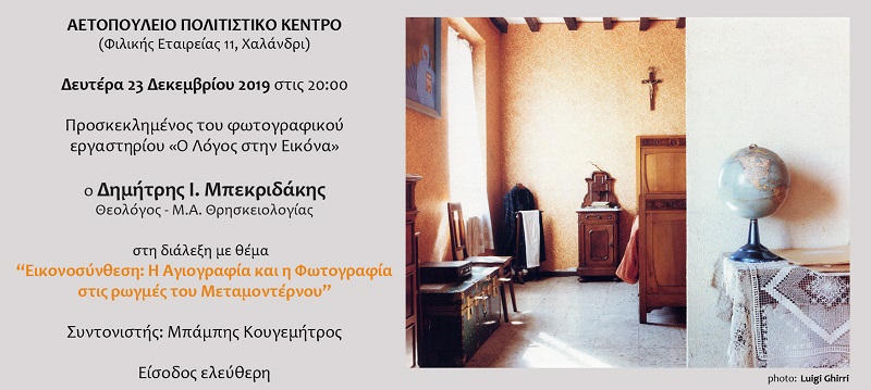 Διάλεξη με θέμα "Εικονοσύνθεση: Αγιογραφία και Φωτογραφία στις ρωγμές του Μεταμοντέρνου", διοργανώνει το Φωτογραφικό Εργαστήριο του Δήμου Χαλανδρίου «Ο Λόγος στην Εικόνα», τη Δευτέρα 23 Δεκεμβρίου 2019 και ώρα 20:00, στο Αετοπούλειο Πολιτιστικό Κέντρο (Φιλικής Εταιρείας 11, Χαλάνδρι).